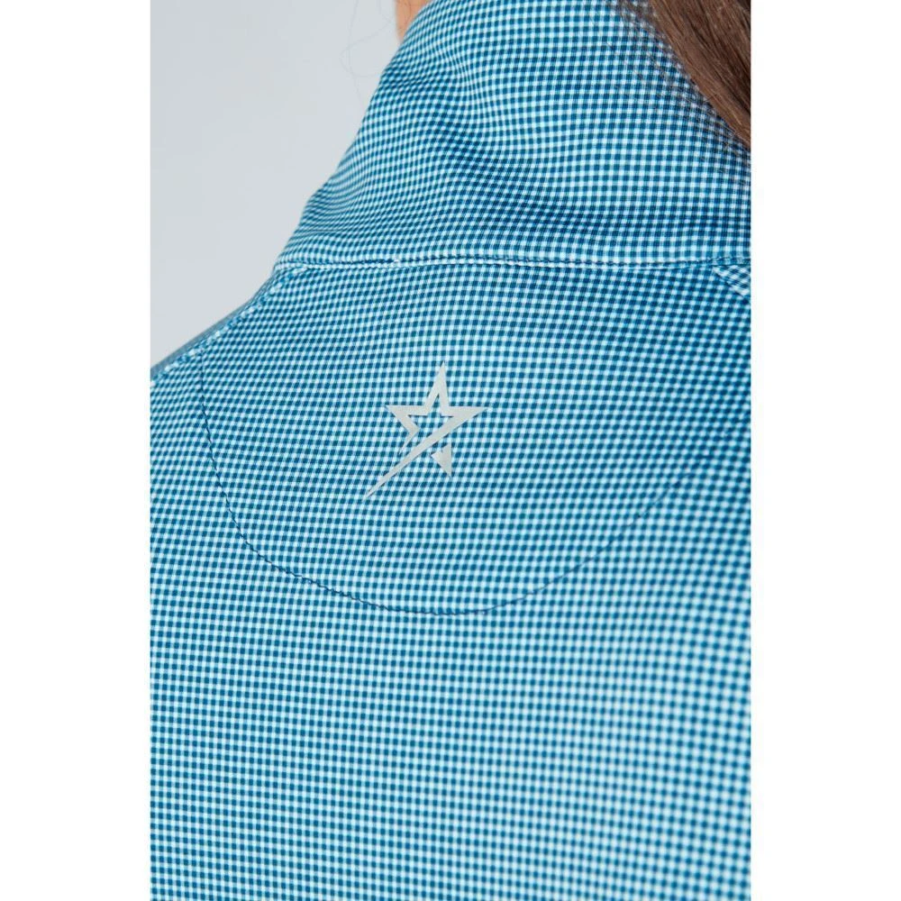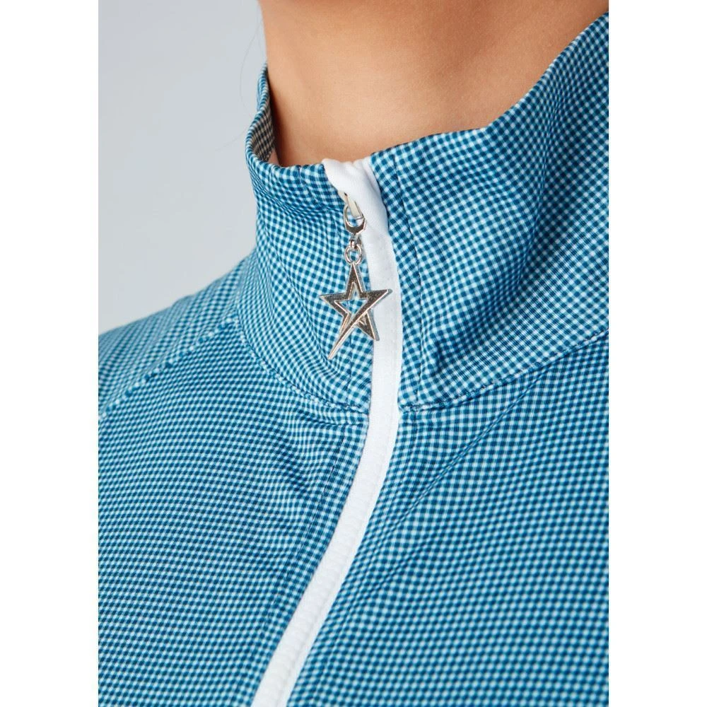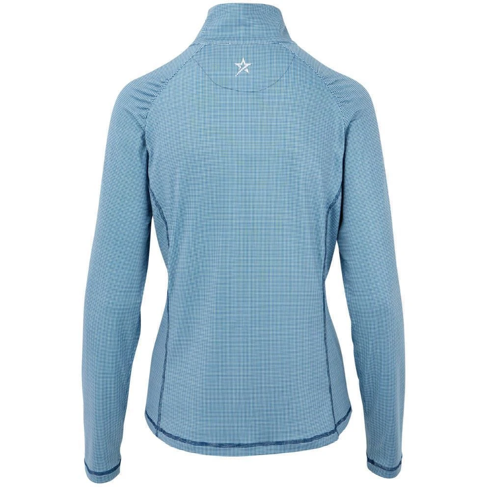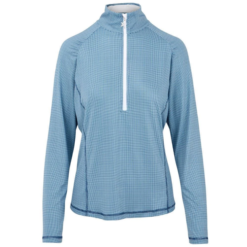 A technical lightweight mid-layer top with a deep zip neck and classic, elegant styling. A relaxed fit with contour seams and pretty gather details give a feminine shape whilst its moisture-wicking, breathable stretch fabric with SPF30+ ensures you stay comfortable when the temperature drops.